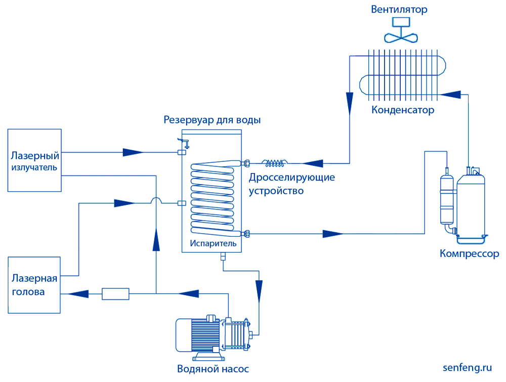 Для корректной работы излучателя и головы их температуры должны быть абсолютно неизменны – вне зависимости от интенсивности работы и параметров окружающей среды. Обеспечить такую неизменность вручную практически невозможно. Требуется полностью автоматизированное устройство, способное должным образом менять скорость и температуру охлаждающей жидкости. Таким устройством является чиллер.