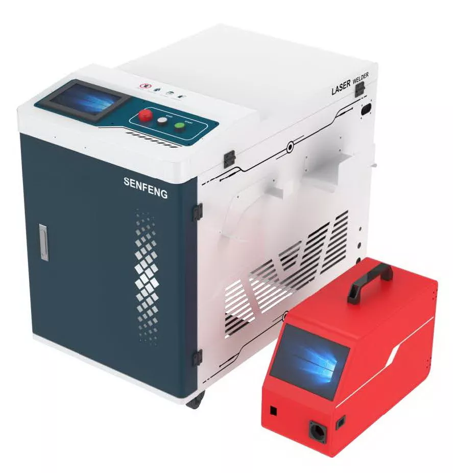 Промышленный оптоволоконный аппарат лазерной сварки металла Senfeng SF2000HW с функциями резки, очистки и зачистки сварных швов. Модель оснащается излучателем мощностью 2 кВт.