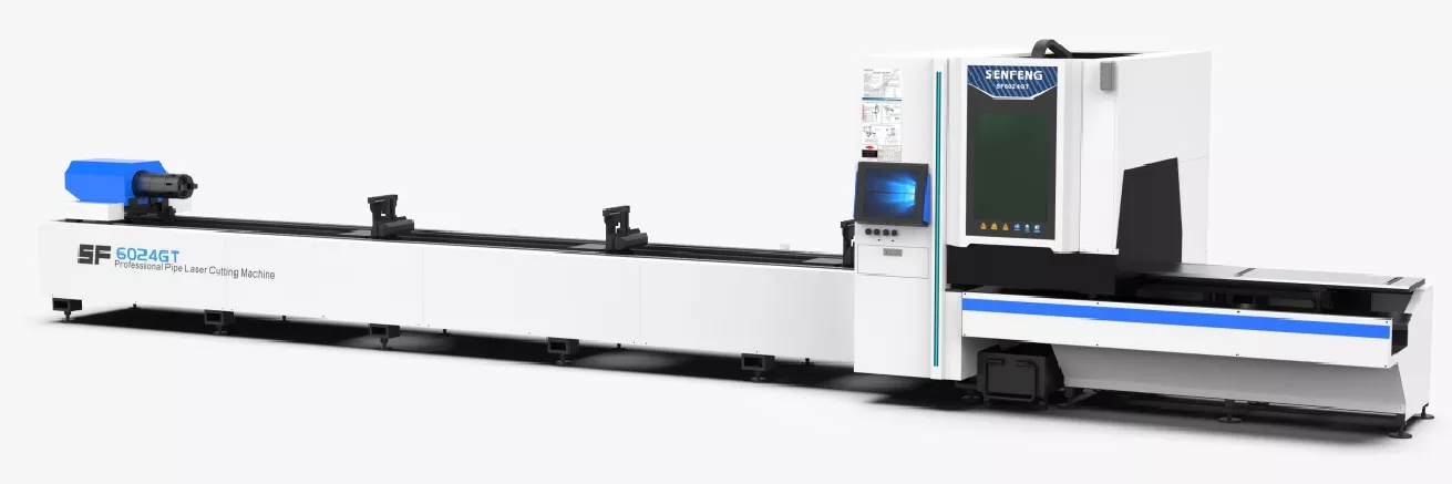 SENFENG SF6024GT - оптоволоконный станок лазерной резки трубного и профильного проката под разными углами (до 45°), с защитой в зоне реза.