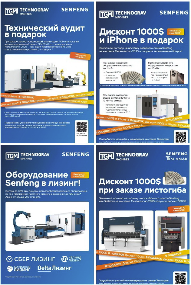 Также напоминаем о приятных подарках нашим новым заказчикам в рамках акционной программы на выставке: При заказе автоматизированной производственной линии Senfeng TOP или покупке поточной линии Senfeng со стенда мы сделаем бонусом технический аудит цеха под устанавливаемую линию, при покупке лазерного станка Senfeng SF3015H4 (12 кВт) со стенда подарим комплект расходных материалов и дополнительный год гарантии (2+1), а при заказе лазерного оборудования Senfeng мощностью до 12 кВт сделаем дисконт 1000 $ с комплектом расходников или вручим iPhone 16 Pro Max или iPad Pro 11 на выбор, тем кто закажет технику Senfeng мощностью от 20 кВт!