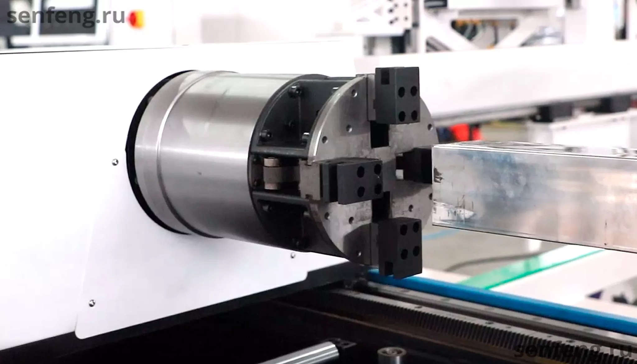 Станок SF12035NT оснащен тремя зажимными пневматическими патронами для резки трубы и профиля практически без отходов.